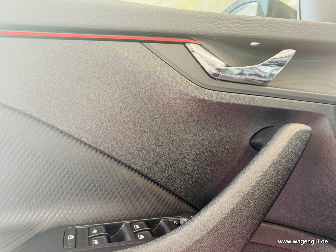 - 3. Bremsleuchte LED, 8 Lautsprecher, Ablagetasche an Vordersitzlehnen, Airbag Beifahrerseite abschaltbar, Airbag Fahrer-/Beifahrerseite, Antriebs-Schlupfregelung (ASR), Außenspiegel schwarz lackiert, Blinkleuchten LED in Außenspiegel integriert, Bremsassistent, Bremsenergierückgewinnung, Dachhimmel schwarz, Edelstahlpedale Sportdesign, Elektr. Bremskraftverteilung (EBV), Elektron. Differentialsperre (EDS), Elektron. Querdifferentialsperre (XDS), Fahrassistenz-System: Auffahrwarnsystem mit City-Notbremsfunktion (Frontradar-Assistent), Fahrassistenz-System: Berganfahr-Assistent (Hill-Holder), Fahrassistenz-System: Dynamischer Fernlichtassistent (Dynamic Light Assist), Fahrassistenz-System: Einschaltautomatik für Fahrlicht (Fahrlichtassistent), Fahrassistenz-System: Fahrprofilauswahl, Fahrassistenz-System: Multikollisionsbremse (Multi Collision Brake), Fahrassistenz-System: Müdigkeitserkennung, Fahrassistenz-System: Spurhalteassistent (Lane Assist), Fahrassistenz-System: Verkehrszeichenerkennung, Fensterheber elektrisch vorn + hinten, Freisprechanlage Telefon mit Bluetooth, Frontkamera, Gepäckraumabdeckung / Rollo, Gepäcksicherung / Gepäckbefestigung (Cargo-Elemente), Geschwindigkeits-Regelanlage (Tempomat) inkl. Geschwindigkeits-Begrenzeranlage, Handschuhfach beleuchtet, Heckleuchten LED mit dynamischem Blinklicht, Heckscheibe heizbar, Infotainment-Paket Bolero, Infotainment-System mit 8,2" Display, Innenraumfilter: Staub- und Pollenfilter, Innenspiegel mit USB-Anschluss (Typ C), Interieur-Design-Paket Monte Carlo, Isofix-Aufnahmen für Kindersitz an Beifahrersitz, Isofix-Aufnahmen für Kindersitz an Rücksitz, Karosserie: 5-türig, Kennzeichenbeleuchtung LED, Klimaanlage Climatronic 2-Zonen, Kofferraumbeleuchtung, Komfort-Paket, Kopf-Airbag-System, Lendenwirbelstütze Sitz vorn links, Lendenwirbelstütze Sitz vorn rechts, Lenkrad (Sport/Leder - 3-Speichen, unten abgeflacht) mit Multifunktion und Schaltfunktion, Lenkrad heizbar, Lenksäule (Lenkrad) verstellbar (vertikal / axial), Licht- und Sicht-Paket Plus, Lichtassistent (Coming Home, Leaving Home), LM-Felgen, Matrix-LED-Scheinwerfer, Mittelarmlehne hinten, Modellpflege, Motor 1,5 Ltr. - 110 kW 16V TSI ACT, Nebelscheinwerfer mit Abbiegelicht, Netzprogramm im Kofferraum, Notrufsystem, Open-Sky-Paket, Otto-Partikelfilter (OPF), Panoramadach fest (Glas), Phonebox, Radioempfang digital (DAB+), Radstand 2651 mm, Reifen-Reparaturkit, Reifendruck-Kontrollsystem, Rückfahrkamera, Rücksitzlehne geteilt/klappbar (1/3-2/3), Schadstoffarm nach Abgasnorm Euro 6e, Schalt-/Wählhebelgriff Leder, Schriftzug schwarz, Schwellerabdeckung / -verkleidung schwarz glänzend, Seitenairbag vorn, Seitenscheiben hinten und Heckscheibe abgedunkelt (SunSet), Service-System: Remote Services, Sitz vorn links höhenverstellbar, Sitz vorn rechts höhenverstellbar, Sitzbezug / Polsterung: Monte Carlo, Sonnenblende links mit Spiegel, Sonnenblende rechts mit Spiegel, Start/Stop-Anlage, Steckdose (12V-Anschluß) im Koffer-/Laderaum, Stoßfängerabdeckung vorn und hinten, schwarz glänzend, Textilfussmatten, Türgriffe außen Wagenfarbe, USB-Ladeanschlüsse (2-fach, Typ C) für 2.Sitzreihe, USB-Schnittstelle vorn (2-fach, Typ C), Verzurrösen Koffer-/Laderaum, Wireless SmartLink