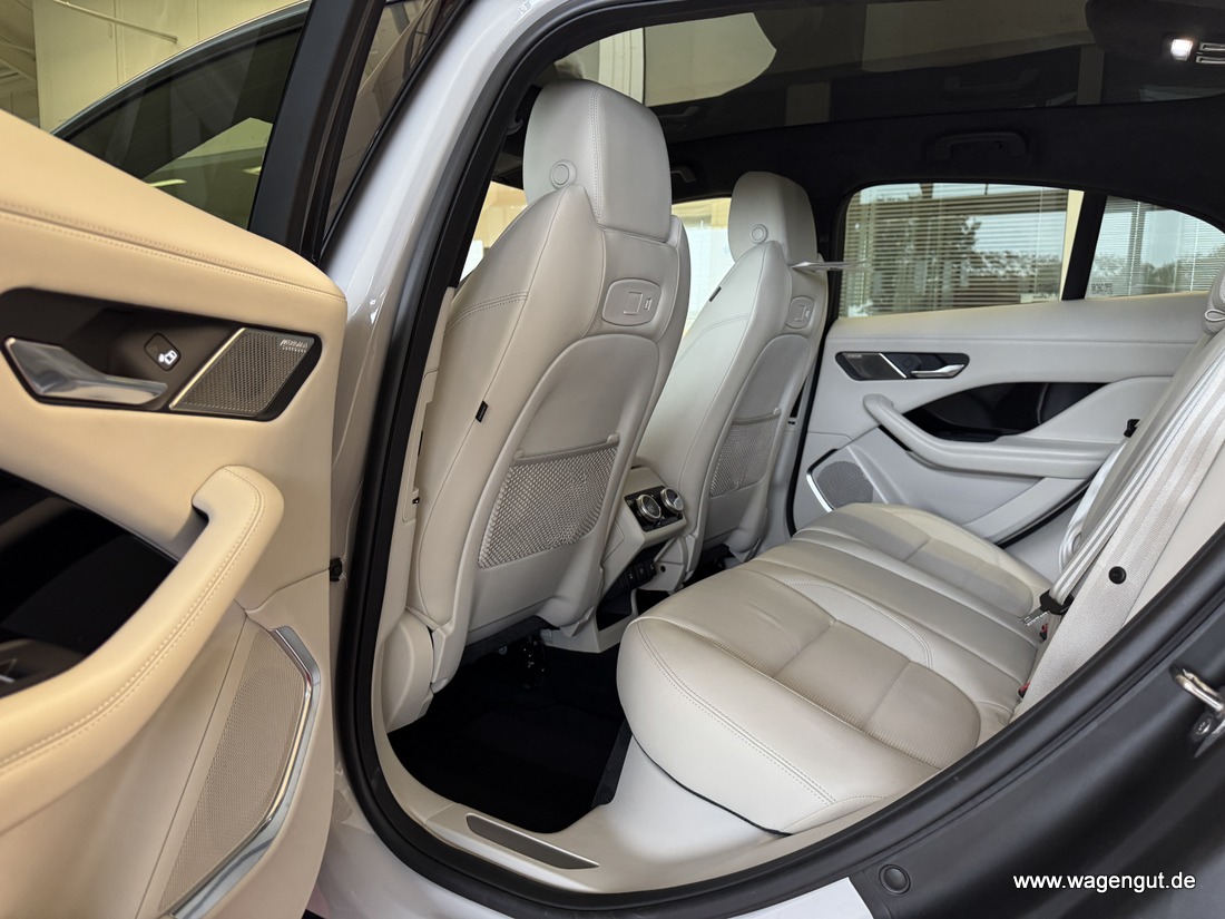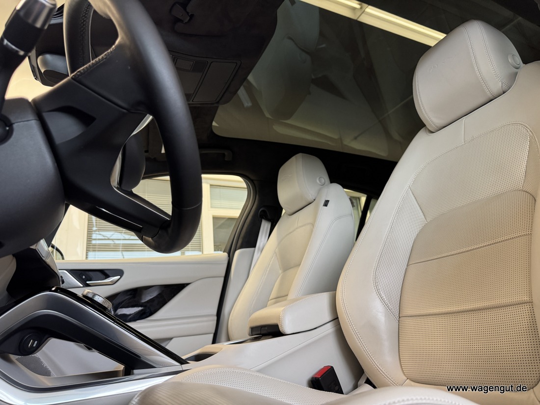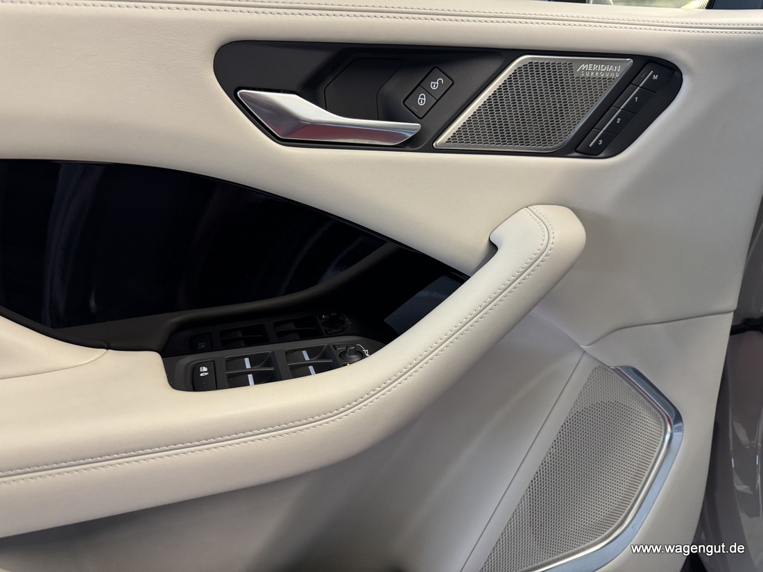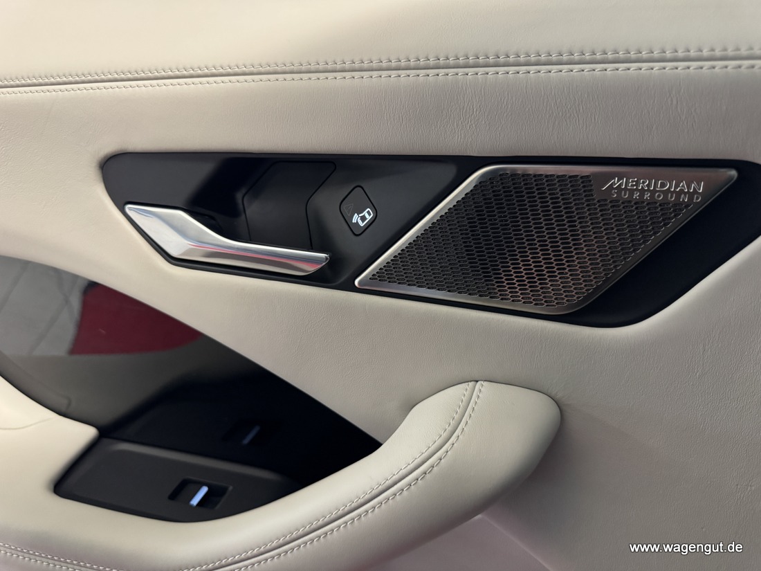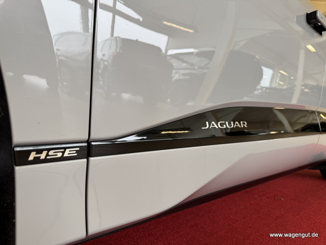 - Airbag Fahrer-/Beifahrerseite, Antriebsart: Allradantrieb, Audio Interface (Universal-Schnittstelle für iPod / AUX / USB / MP3), Audiosystem Meridian 825 Watt Surround-Klangsystem (Radio/CD-Wechsler, MP3), Außenspiegel elektr. verstell-, heiz- und anklappbar, mit Abblendautomatik, Memoryfunktion und Umfeldleuchte, Außenspiegel Wagenfarbe, Bluetooth-Schnittstelle, Bremsenergierückgewinnung, Brillenfach in Dachhimmel / Dachkonsole integriert, Diebstahlschutz-System satellitengestützt (InControl Secure), Einschaltautomatik für Fahrlicht / Lichtsensor, Elektromotor 294 kW (cont. 172 kW, Dual-Elektromotor), Fahrassistenz-Paket 2, Fahrassistenz-System: Adaptive Geschwindigkeitsregelanlage mit Verkehrszeichenerkennung, Fahrassistenz-System: Antriebsmomentkontrolle (Torque Vectoring), Fahrassistenz-System: Aufmerksamkeits-Assistent, Fahrassistenz-System: Berganfahrhilfe (Hill-Holder), Fahrassistenz-System: Spurhalteassistent, Fahrassistenz-System: Spurverlassenswarnung, Fahrassistenz-System: Verkehrszeichenerkennung, Fahrassistenz-System: Warnsystem Totwinkel bei Türöffnung hinten, Fensterheber elektrisch vorn + hinten, Frontscheibe Verbundglas, Frontscheibe wärmedämmend, Geschwindigkeits-Regelanlage geländeabhängig (All Surface Progress Control, ASPC), Getriebe für Elektrofahrzeug, Getränkehalter hinten, Getränkehalter vorn, Heckklappenbetätigung elektrisch (mit Gestiksteuerung), Heckleuchten LED, Heckscheibe heizbar, Heckschürze, Heckspoiler, InControl Apps, InControl Apps Mobile Online Dienste, InControl Remote Premium (Onlinedienste / Apps), InControl-Connect-Paket Pro, Infotainment-System: Pivi Pro, Innenausstattung: Dekoreinlagen Gloss Black, Innenspiegel mit Abblendautomatik, Instrumentenanzeige TFT-Infodisplay HD, JaguarVoice Sprachsteuerung, Karosserie: 5-türig, Kindersicherung elektrisch, Kopf-Airbag-System (Windowbag), Ladekabel mit Typ 2-Stecker (Mode 3), Ladevorrichtung On-Board-Lader, Lenkrad (Sport/Leder), Leseleuchten im Fond, Leuchtweitenregelung automatisch, Lichtassistent (Coming Home, Leaving Home), Make-up-Spiegel im Fond beleuchtet, Matrix-LED-Scheinwerfer mit LED-Signatur, Mittelarmlehne hinten, Nebelschlussleuchte integriert, Nichtraucher-Paket, Park-Paket (Einparkhilfe), Parkbremse elektronisch (EPB), Radstand 2990 mm, Reifen-Reparaturset, Reifendruck-Kontrollsystem, Rücksitzlehne geteilt/klappbar, Seitenairbag vorn, Sitze vorn elektr. verstellbar (18-Wege, mit Memory) inkl. Klimatisierung und Sitzheizung vorn und hinten, Smog-Sensor / Luftgütesensor, Sportsitze Leder Windsor, Standheizung mit Fernbedienung und Zeitschaltuhr (Timer), Taschenhaken im Gepäckraum, Verzurrösen Koffer-/Laderaum, Warnanlage für Sicherheitsgurte