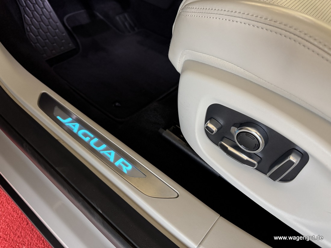 - Activity Key, Ambiente Interieurbeleuchtung, konfigurierbar, Ausstattungs-Paket: Black Pack, Basishalterung in Fahrer- und Beifahrersitzlehne integriert (Click and Go), Dachhimmel Premium-Velours, Diebstahlsicherung für Räder (Felgenschlösser), Einstiegsblenden (Edelstahl) beleuchtet, mit Schriftzug Jaguar, Fußmatten, Gepäckraum-Abtrennung (Netz), Handschuhfach mit Kühlfunktion, Head-up-Display, Heckscheibe abgedunkelt, Ionisator zur Luftreinigung, Klimaautomatik 4-Zonen, Leder-Paket erweitert, LM-Felgen 8,5x22 (5-Doppelspeichen, diamantgedreht / Style 5056), Metallic-Lackierung, Panoramadach (Glas), Radioempfang digital (DAB+), Sender für Garagentoröffner (integriert)